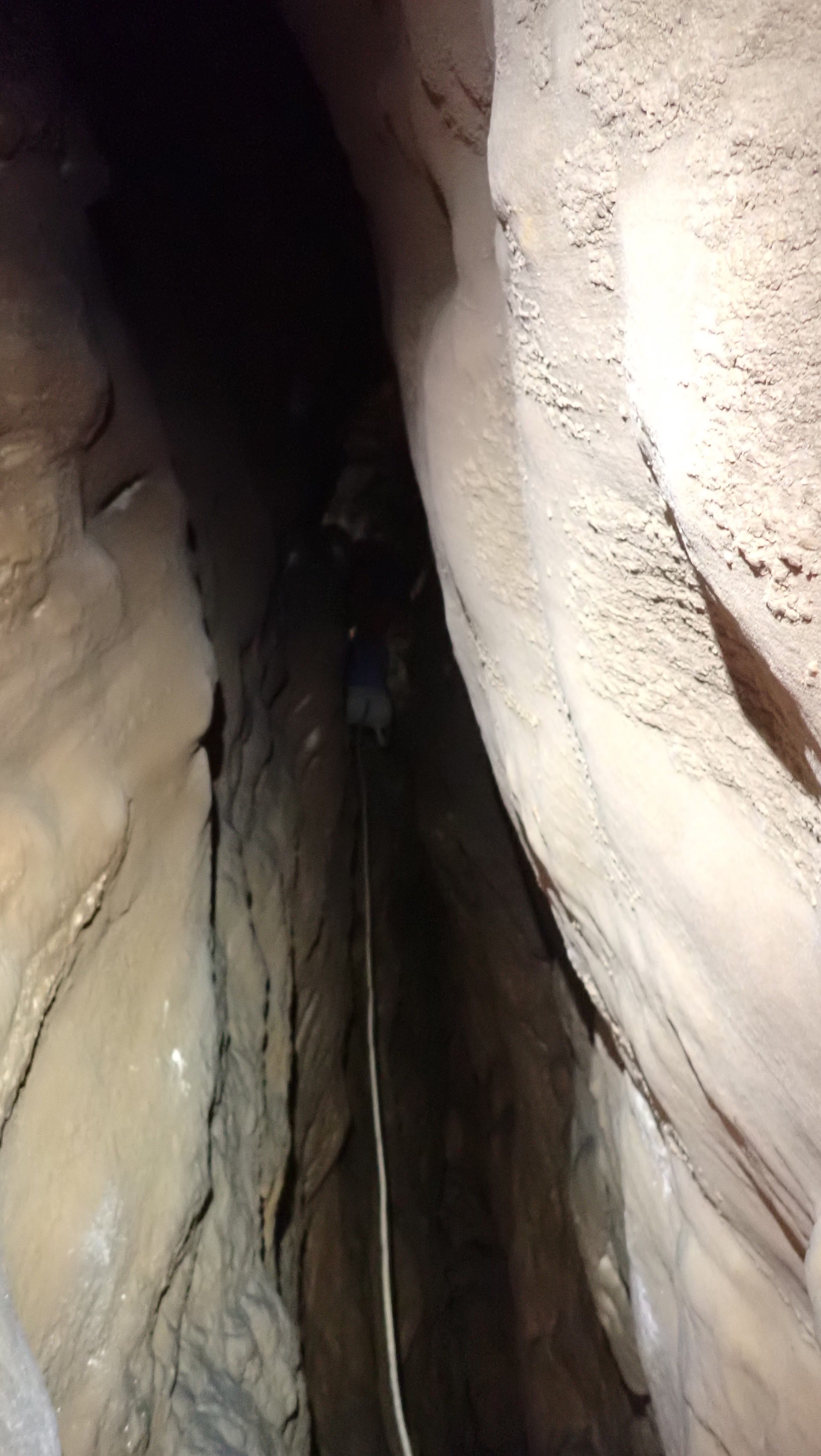 Els vaig comentar l'error i començaren a pujar. Mentres amb la corda que sobrava del primer pou vaig començar a instal·lar el camí correcte, però com ja no tenia més material vaig haver d'esperar que vingueren els companys. Després de moltes risses per l'equivocació (de fet no paràvem de dir-me que no els quadrava res, normal!) continuarem amb la instal·lació esta vegada pel camí correcte.